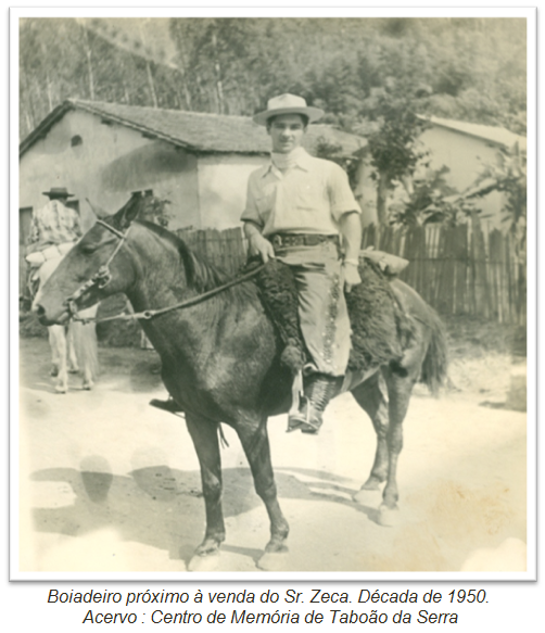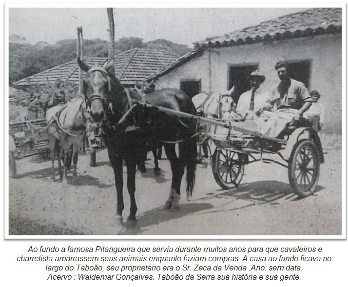 “Taboão (...) Situado às margens da Estrada de M’Boy , na encruzilhada que dá acesso também a Santo Amaro, nosso pequeno e principal núcleo populacional eram as famílias e o pequeno comércio de “beira de estrada”, do atual Largo do Taboão. Era a venda do Seo Zeca, apelido carinhoso do Sr. José André de Moraes, com a sua pitangueira à porta, onde os fregueses amarravam os seus cavalos enquanto tomavam um trago ou faziam suas compras.”[34]