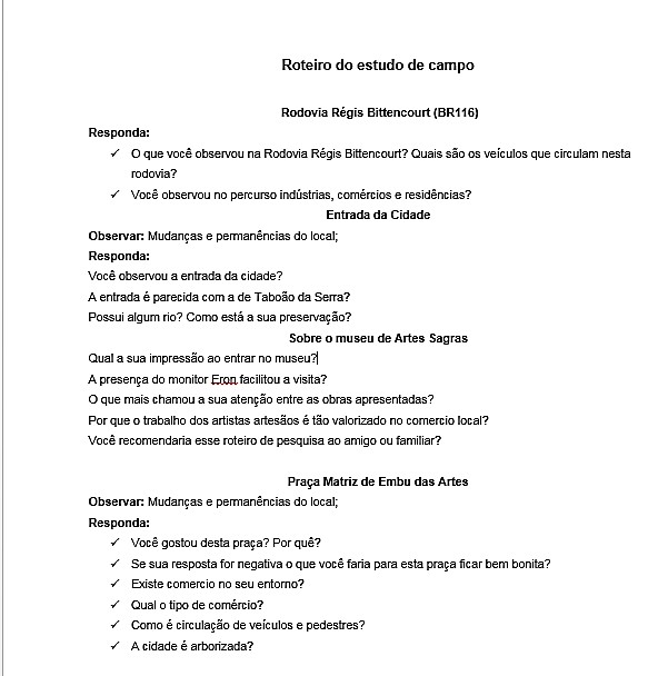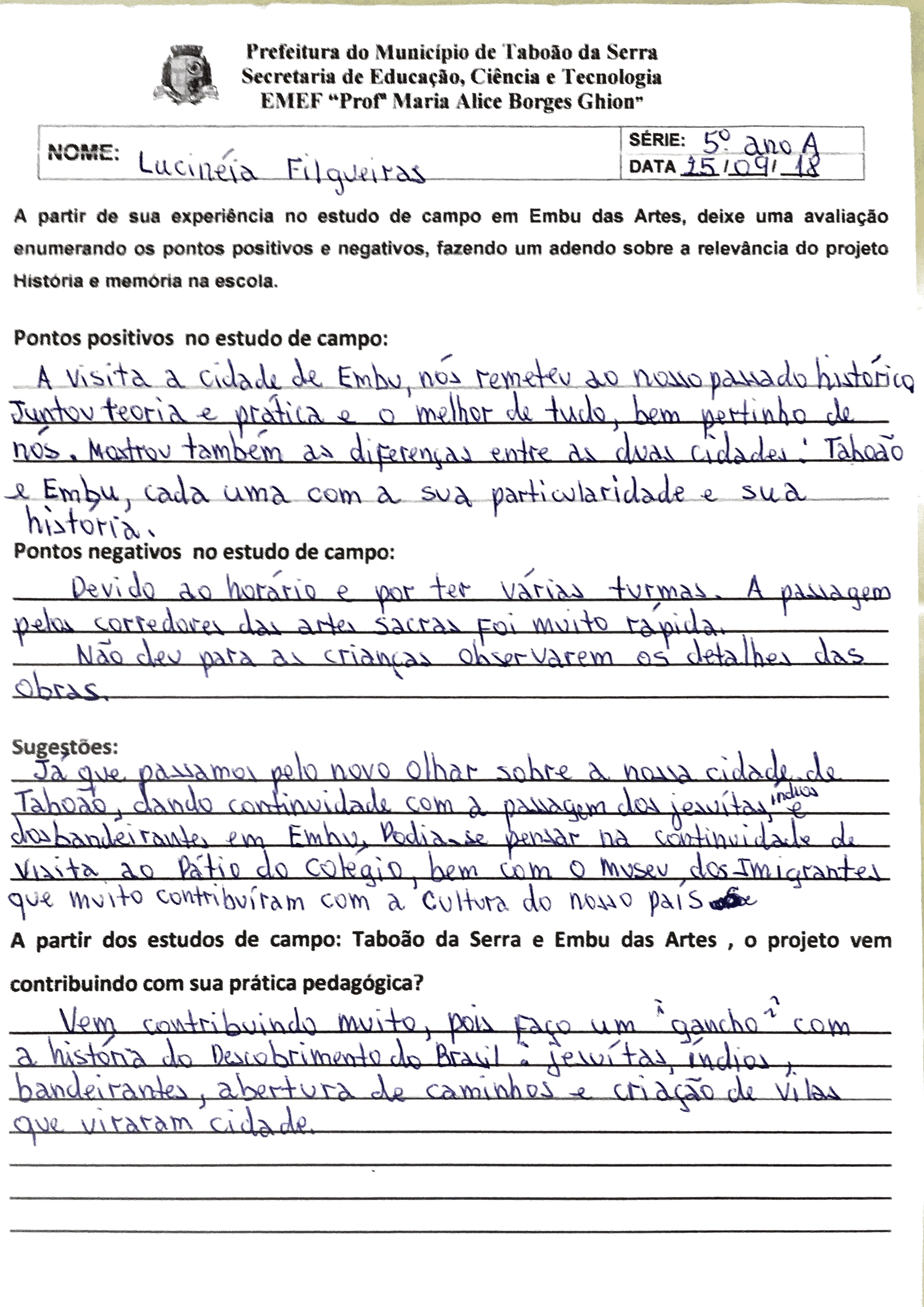 A atividade extracurricular proposta levou em consideração que os educandos através de estudos iniciais construíram uma certa relação da escola e do bairro com os principais tópicos da memória coletiva da cidade. Nessa perspectiva os estudos perpassam as fronteiras da cidade e transcendem para a cidade vizinha de Embu das Artes, onde realizou-se o estudo de campo.
