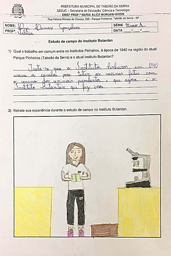 O estudo de campo dos alunos dos 4º anos no Instituto Butantã, como parte das atividades do Projeto: História e Memória na Escola articulado com o estudo do livro Taboão da Serra: profundas raízes, teve como objetivo conhecer e estudar a instituição observando a relação do Instituto Pinheiros da década de 1940 em Taboão da Serra, com o atual Instituto Butantã na produção de soros e vacinas.