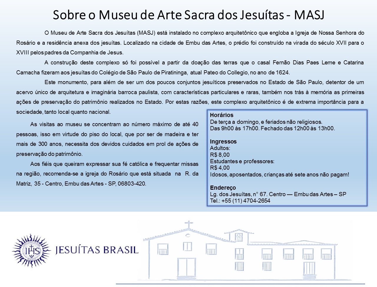 Para os interessados, o museu de Arte Sacra dos Jesuítas pode ser visitado conforme os horários abaixo: