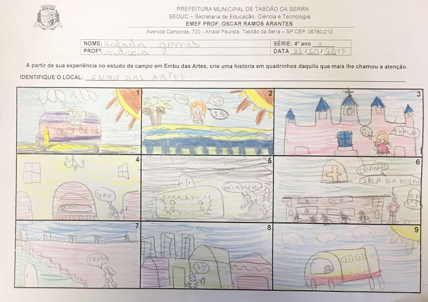 Produto final realizado pela educanda Rafaela Gomes, 4º ano A sobre a experiência durante estudo de campo à cidade de Embu das Artes e o Museu de Arte Sacra dos Jesuítas. Ano 2019. Acervo: Prefeitura Municipal de Taboão da Serra.