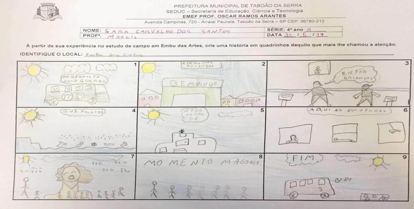 Produção final em quadrinhos realizado pela educanda Sara Carvalho dos Santos. EMEF Prof. Oscar Ramos Arantes. Ano 2019. Acervo: Prefeitura Municipal de Taboão da Serra.