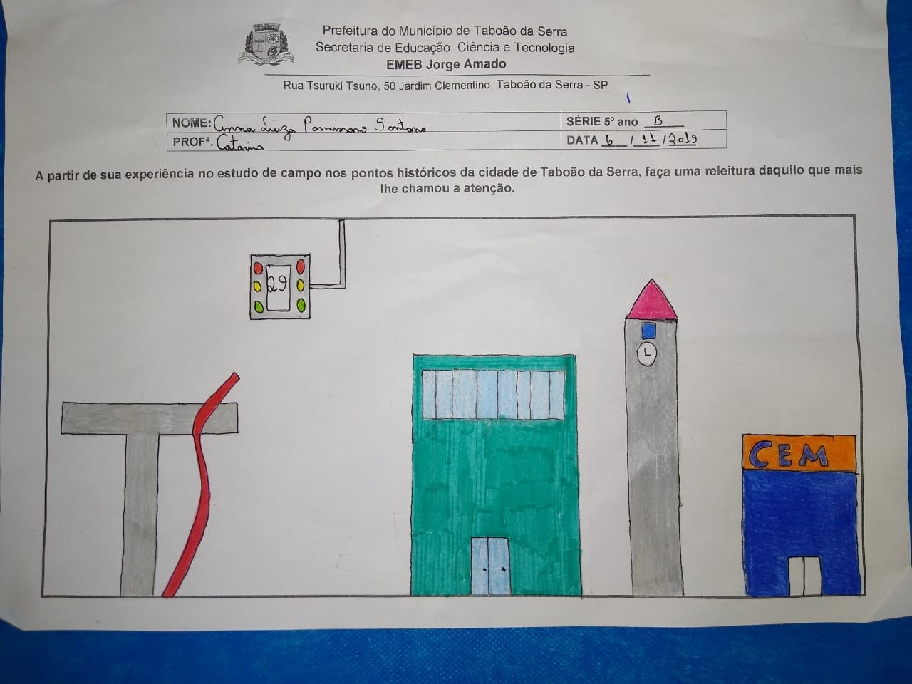 Produto final realizado pela aluna Anna Luiza Parmissano Santana. Entrada da cidade. EMEB Jorge Amado. Ano 2019. Acervo: Prefeitura Municipal de Taboão da Serra.